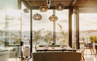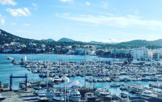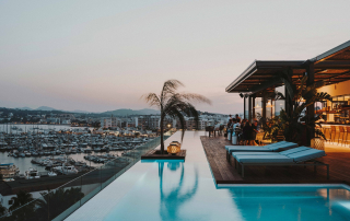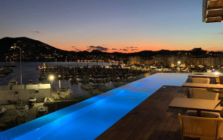 Desde la azotea del hotel Aguas de Ibiza (un 4*) hay espléndidas vistas al puerto y la bahía de Santa Eulalia.